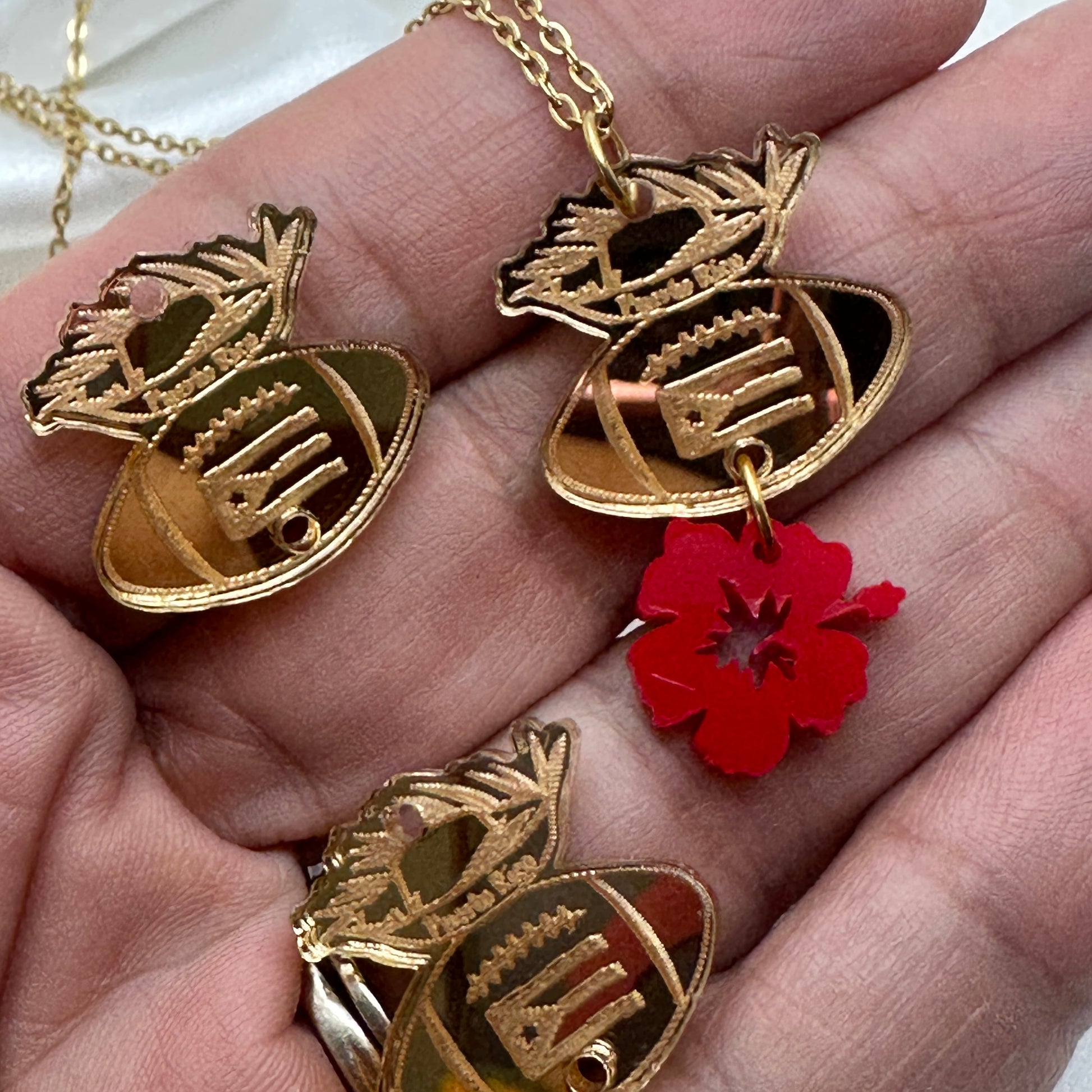 Descripción Conector en Acrílico Dorado con forma de futbol y pava