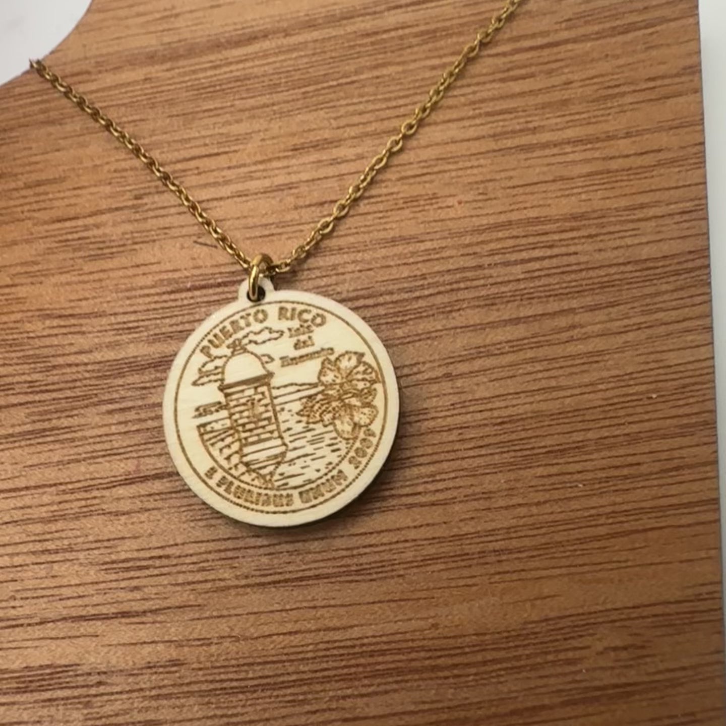 Descripción:¡Lleva contigo un pedazo de Puerto Rico con este dije de moneda engravado en madera! Perfecto para creadoras de bisutería y fanáticas de SANSE. Añade un toque único a tus ventas !