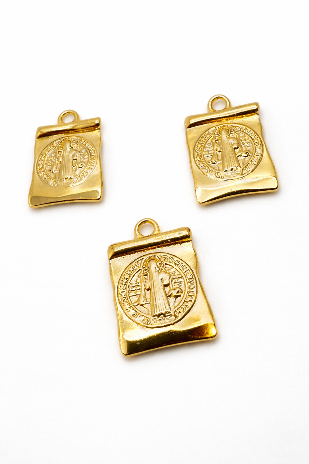 Descripción Esta medalla tipo Escapulario de San Benito es una pieza ideal para ser colgada en cadenas gold plated y usada como colgante. Enchapada en Oro 18k